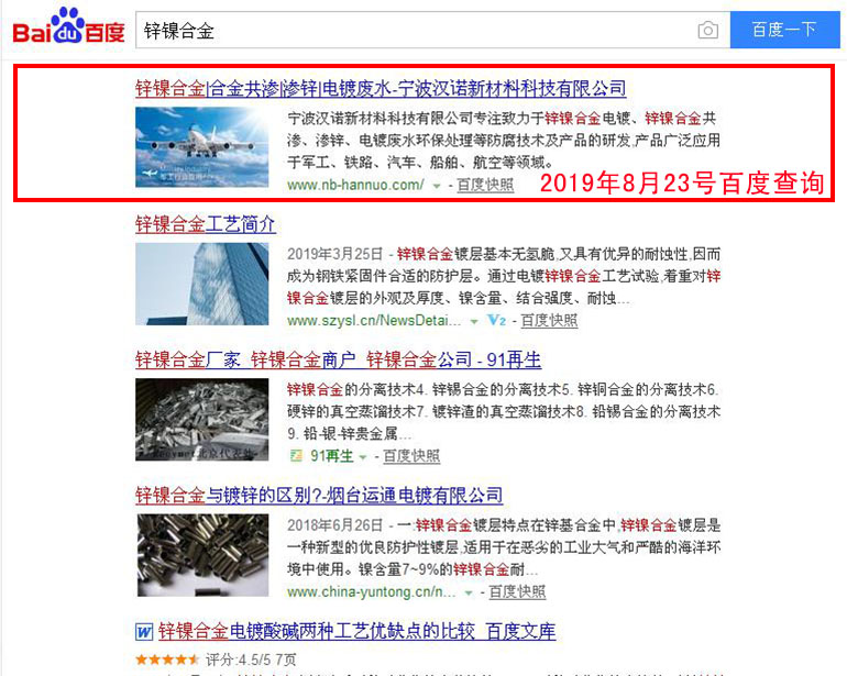 鋅鎳合金 百度(PC)自然排名第1名,360搜索、搜狗、手機(jī)搜索等均也有比較好的排名...